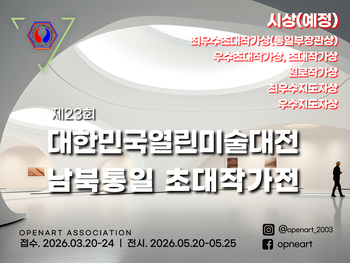 ‘대한민국열린미술대전’은 신진 작가 발굴과 민족 화합을 도모하는 문화 행사입니다. 본 대전의 정수인 남북통일 초대작가전은 분단의 아픔을 예술로 승화하고, "평화와 통일"이라는 시대적 소명을 시각적 언어로 풀어내는 권위 있는 자리입니다.
